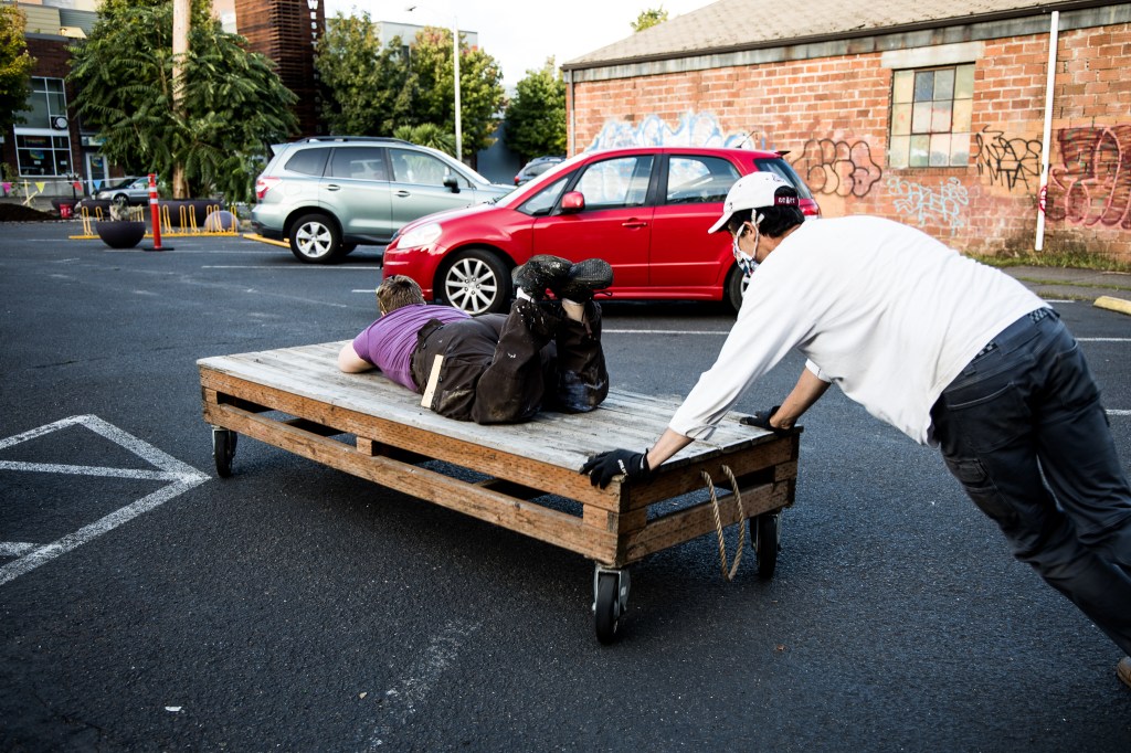 This is a space where in rain or shine, unhoused citizens of Eugene would gather in the parking lot below, looking for food, shelter, and community. Menna explains the idea of the project being, “For this community, which is disenfranchised, they don’t have the right to have an experience of housing in the city they live in. Isn’t it justice that this city would be everybody’s house?” Menna also made us question, “How do you design a house outside of the normative structure of society, and outside centers of power and economics?” How could we produce a cultural installation that also transforms into a shelter—an installation of compassion.