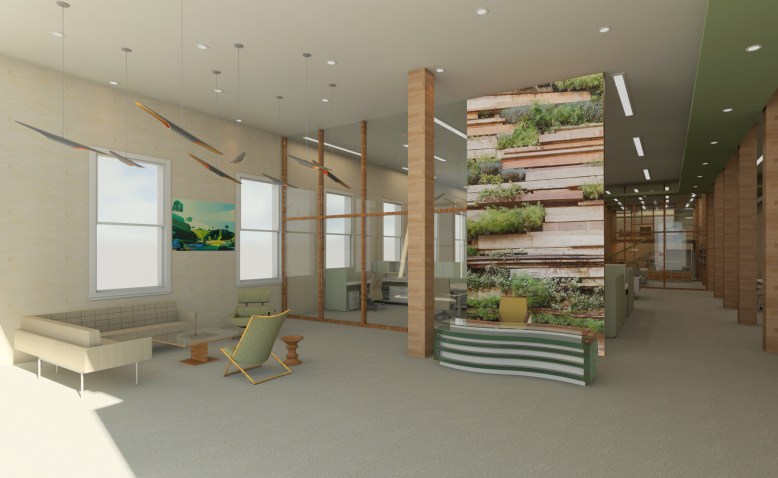 The office integrates biophilic design elements such as natural materials and finishes, plants, natural light, and views of nature to enhance productivity and the well-being of employees.
