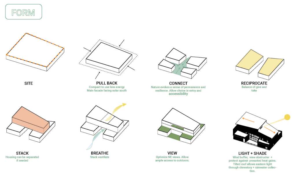 This studio explored the architectural implications and opportunities that arise in creating designs to support emotional and physical health during times of health crises, whether at the personal and family level, or at the community or national scale. In addition, as human health is closely tied with healthful built environments, and with the health of the greater environment, the studio explored a wide-range of issues of environmental sustainability, incorporating those ideas not only as functional and practical elements, but also exploring how those elements can inform, and even become, the architecture itself, while also analyzing, documenting and detailing the solutions in a structured way for presentation.