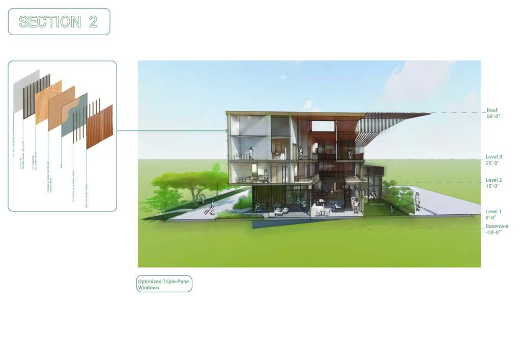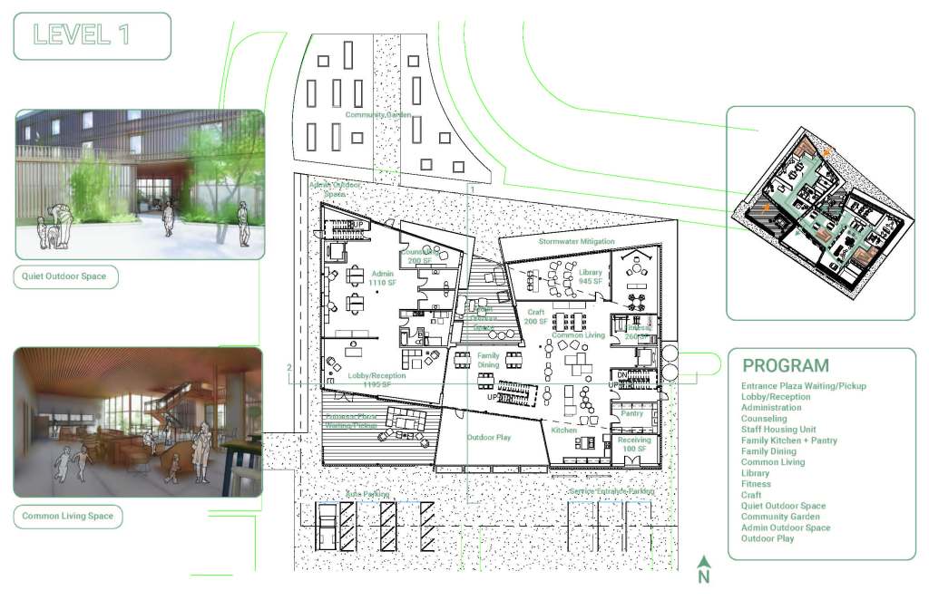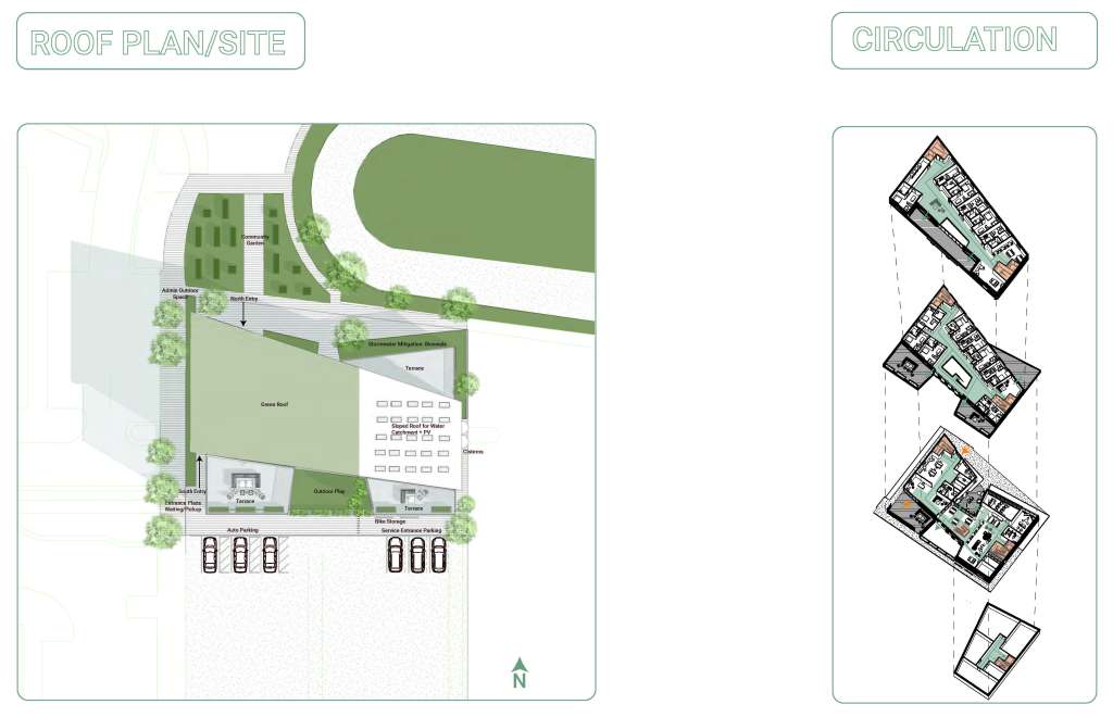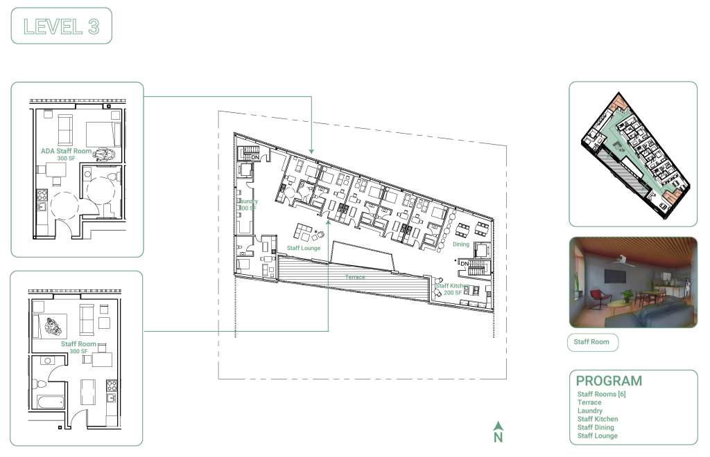The project for the studio is the design of a multi-family, multi-story facility intended primarily as short- to medium-term housing units for families of patients at a community hospital, as well as associated support spaces for community gathering, cooking, dining and living. The facility also includes several units dedicated to short-term incidental housing for medical staff at the hospital that are in need of respite accommodations when working with situations that require them to be at the hospital for extended periods of time. In addition, the facility is designed to be flexible and resilient such that it can be used both entirely for medical staff, or quickly adapted to overflow or quarantine patient use, in times where the hospital is responding to broader natural disaster, pandemic or other large-scale emergent situations.
